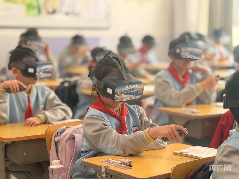 学生们头戴VR眼镜为界碑描红(央广网记者 褚夫晴 摄)